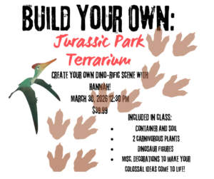 BUILD YOUR OWN: Jurassic Park Terrarium! Class includes: container, soil, two (2) carnivorous plants, dinosaur figures & misc. decorations! Cost: $39.99 + tax Email Hannah to register: an***@**********et.com
